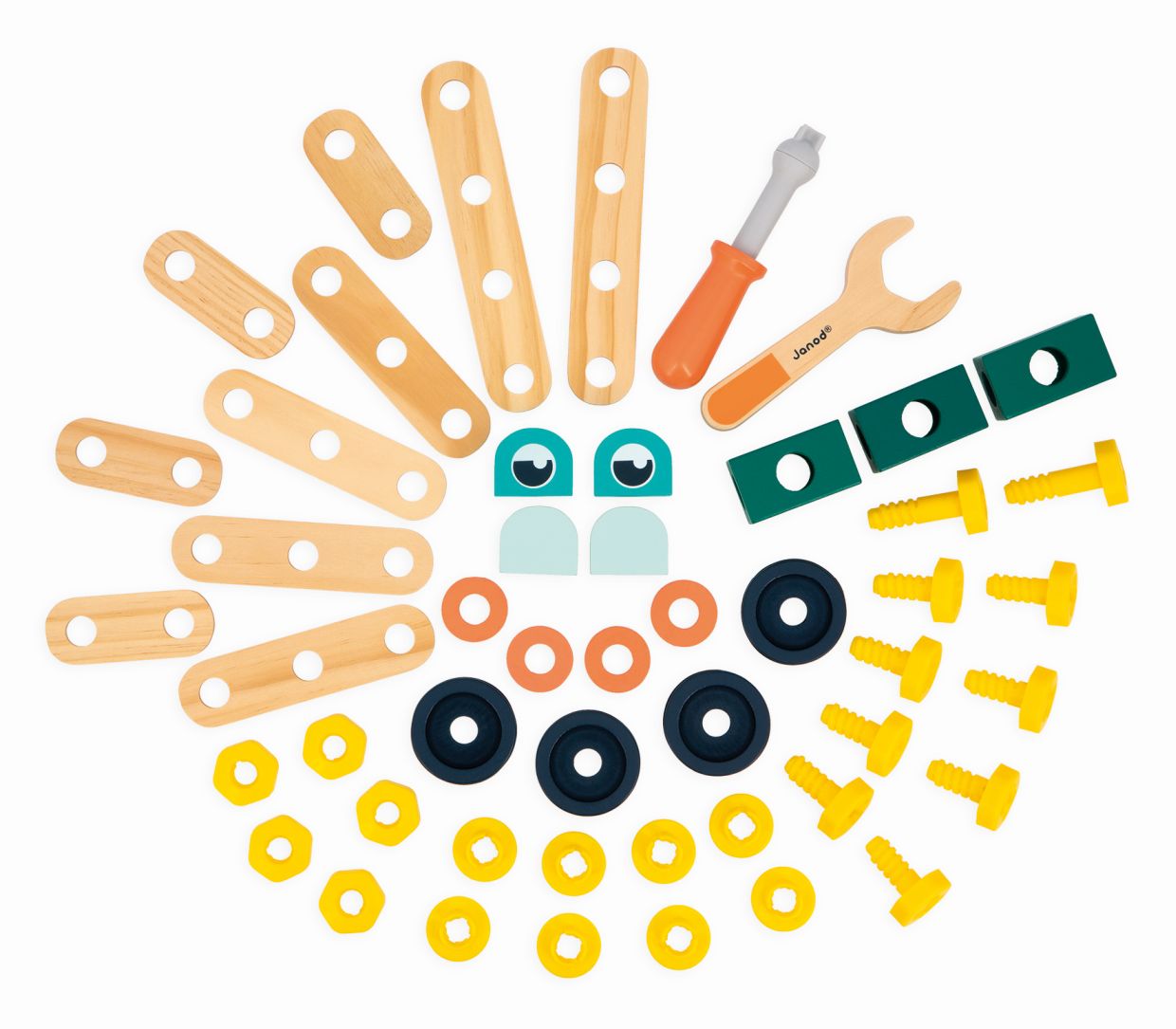Bote con 50 piezas para hacer bricolaje. Con 10 tarjetas con diferentes figuras para montar donde indican además las piezas necesarias. Incluye las herramientas!! Imagina la figura que quieras y móntala!!