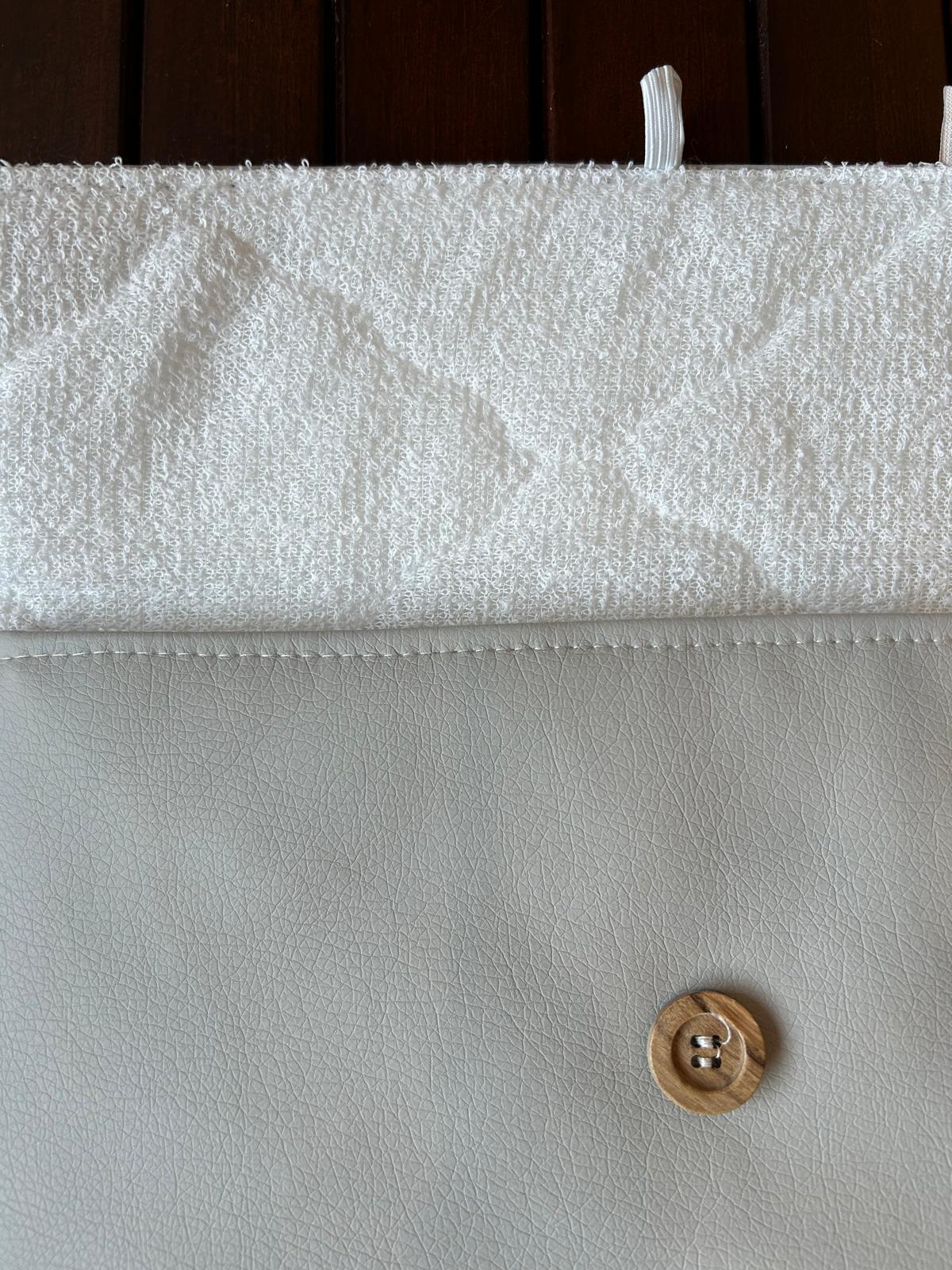 Disponible en tres tonos suaves y neutros —gris, beige y blanco roto—, combina con cualquier bolso maternal y aporta un toque de serenidad allá donde lo lleves. El cierre de botón de madera le da ese detalle artesanal que enamora a primera vista.