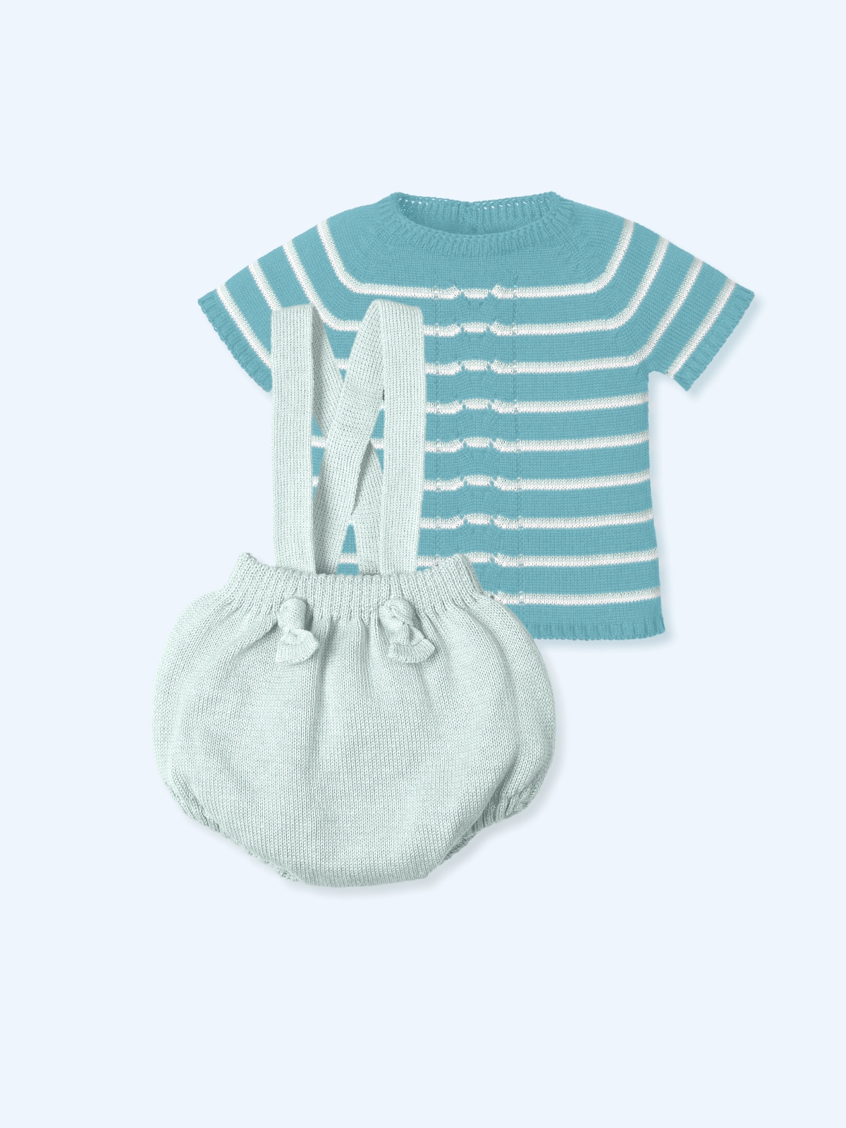 Peto y jersey de manga corta de punto. Peto color celeste estilo ranita  y jersey de punto color turquesa (oasis) con rayas horizontales en celeste y blanco, abotonado a la espalda hasta abajo . Hecho es España. 9656