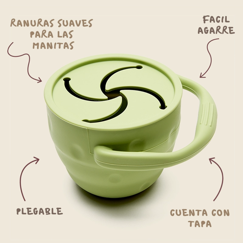La Taza Harry porta snacks es perfecto para los niños en movimiento. Su diseño antiderrames garantiza una experiencia sin complicaciones, incluso en las manos más inquietas. Cuenta con una apertura de ranuras diseñada especialmente para que los niños puedan introducir sus manos y coger el alimento fácilmente, manteniendo la comida segura en su interior. Además, su característica plegable lo hace fácil de transportar y guardar cuando no está en uso, siendo un aliado para salidas y viajes.