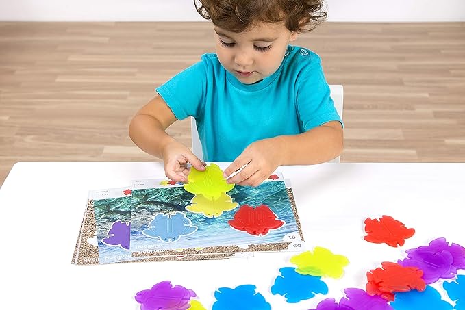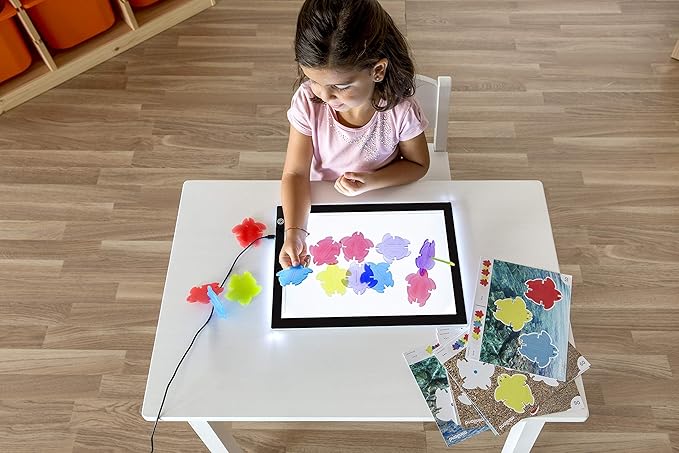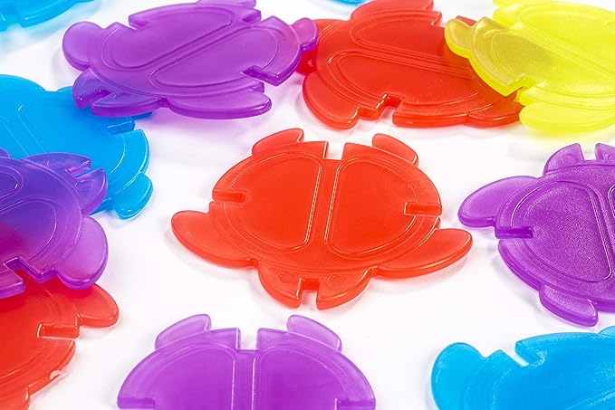 Sus colores translúcidos permiten utilizarlas también sobre mesas de luz, potenciando la exploración visual mientras se trabaja la clasificación, el conteo o la seriación.