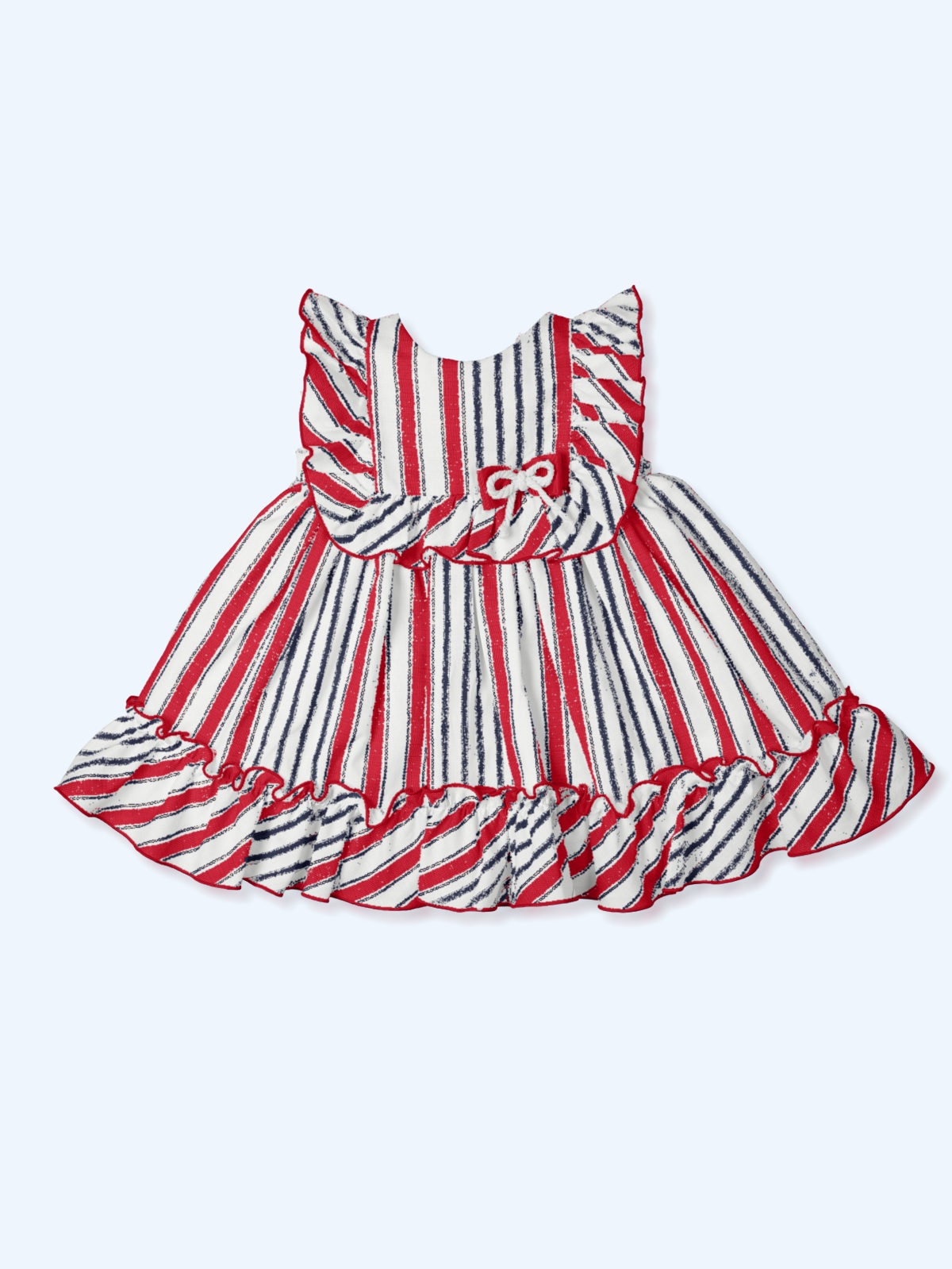 Vestido 100% de algodón de rayas azules y rojas, detalle en camel, Volante en el babero y en el bajo del vestido. Espalda abotonada de arriba a abajo. Forrado entero. Hecho en España. 9756