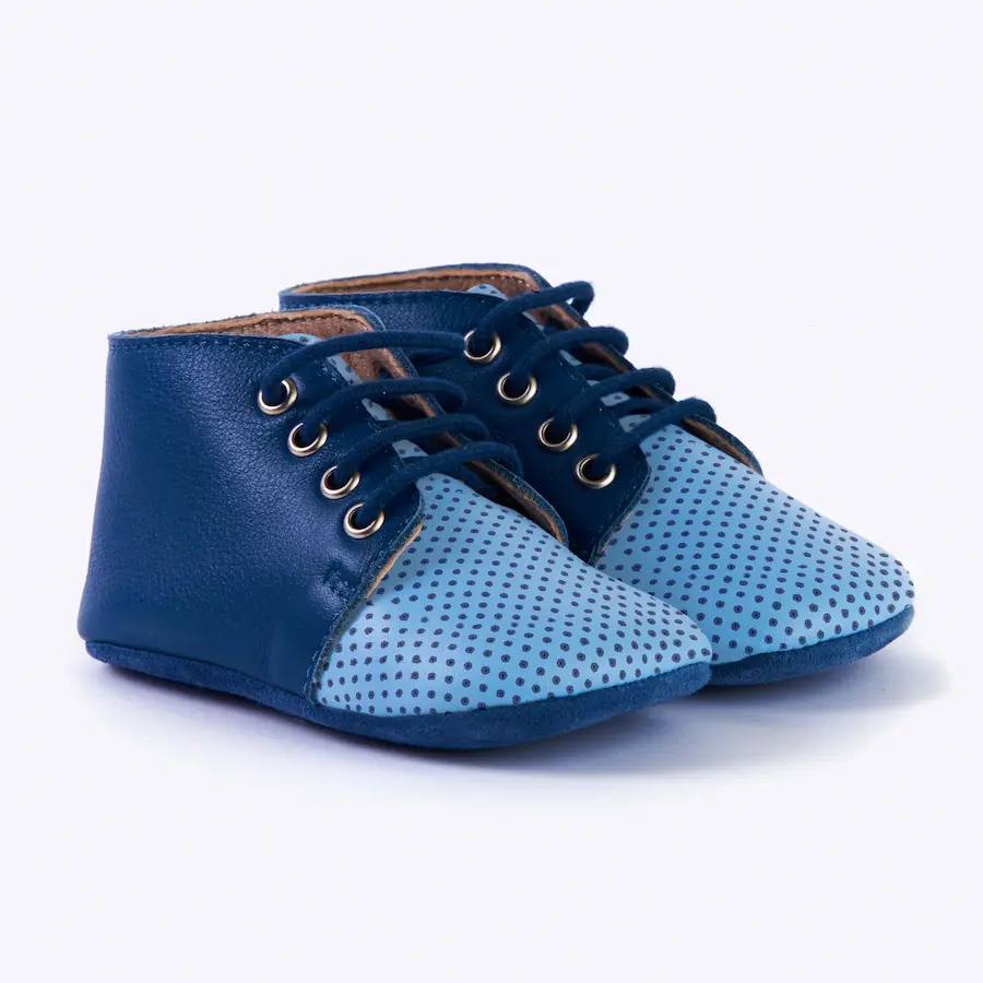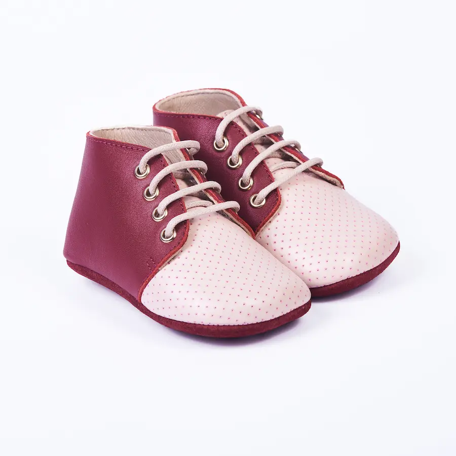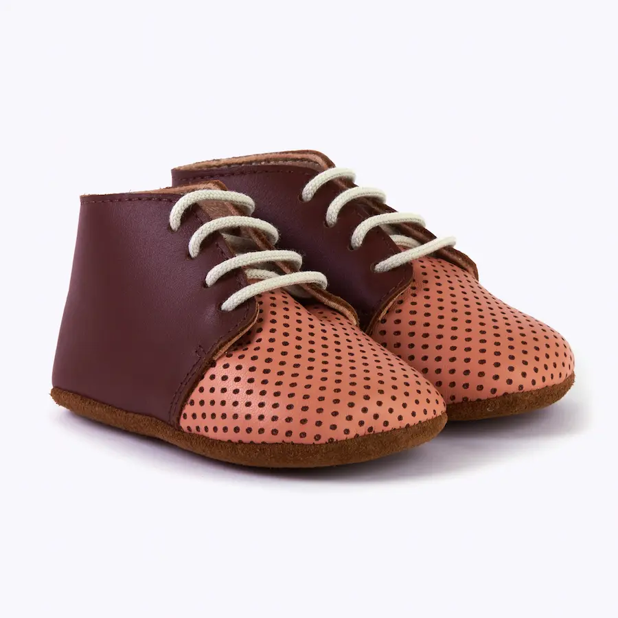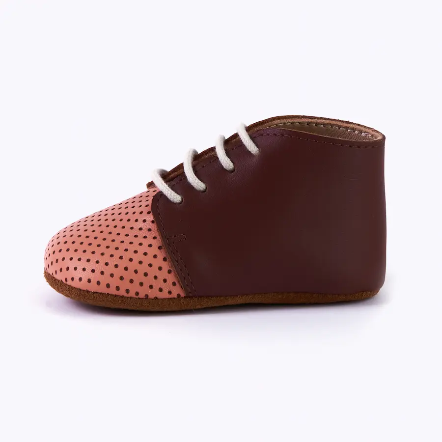 En cuanto a la calidad de los materiales, utilizamos exclusivamente pieles de ternera 100% curtidas de forma vegetal para el corte del zapato. Este proceso de curtición sin productos químicos dañinos asegura una piel suave, flexible y transpirable para los pies sensibles de tu bebé, manteniéndolos frescos y cómodos en todo momento.